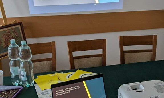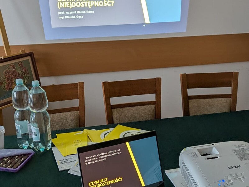 Tekst alternatywny: przestrzeń szkoleniowa z wyświetlaną prezentacją "Świadomośc niepełnosprawnosci".
